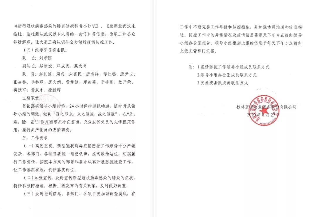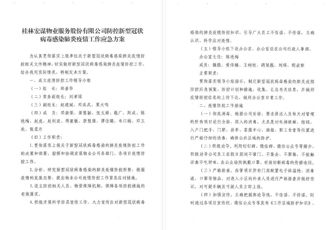 一、為認(rèn)真貫徹落實(shí)上級(jí)單位關(guān)于新型冠狀病毒感染肺炎疫情防控相關(guān)文件精神,將疫情防控工作落到實(shí)處,宏謀物業(yè)制定《桂林宏謀物業(yè)服務(wù)股份有限公司防控新型冠狀病毒感染肺炎疫情工作應(yīng)急方案》,成立疫情防控工作領(lǐng)導(dǎo)小組,以便統(tǒng)籌指揮協(xié)調(diào)相關(guān)工作。同時(shí)成立以總經(jīng)理劉孝國同志任隊(duì)長的物業(yè)公司黨員突擊隊(duì),在“急,難,險(xiǎn),重"等工作面前,黨員同志帶頭沖在前面,充分發(fā)揮黨員的先鋒模范作用,履行共產(chǎn)黨員的光榮職責(zé)。