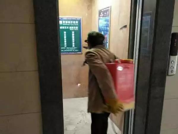 ▲桂醫(yī)·熙境項(xiàng)目對(duì)電梯、單元樓大廳、客服中心等地噴灑消毒水。