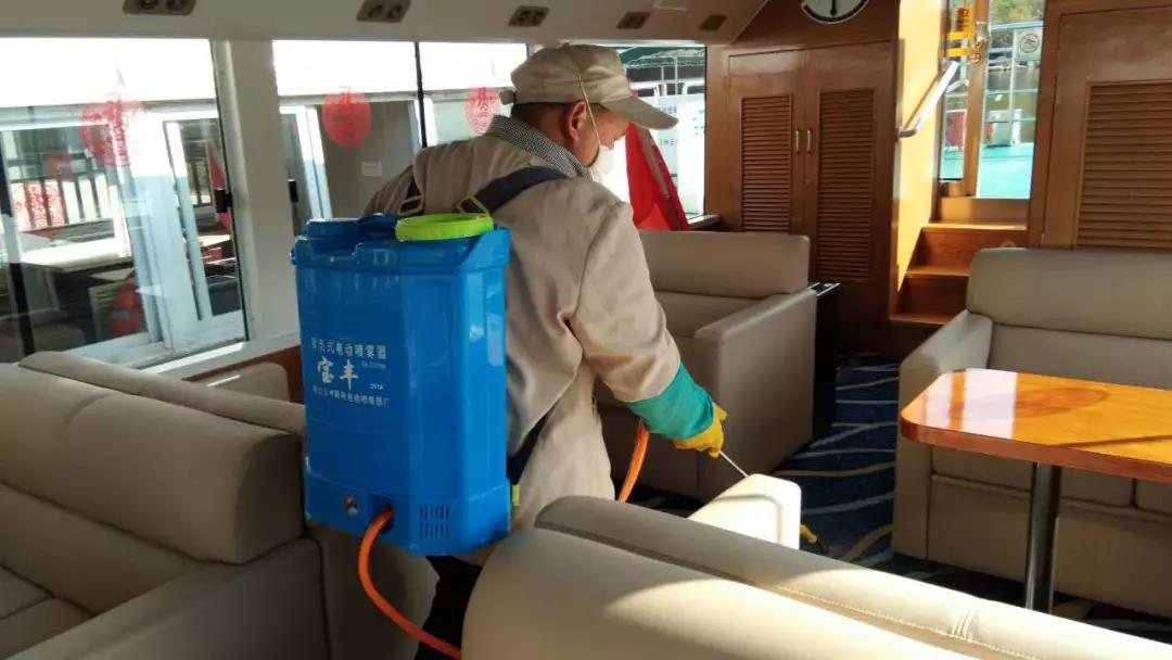 ▲游船項(xiàng)目對(duì)碼頭、游船內(nèi)部進(jìn)行消毒。