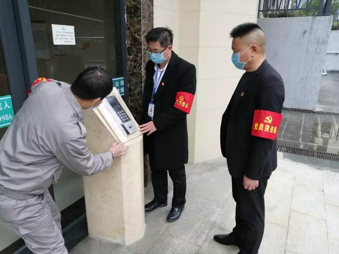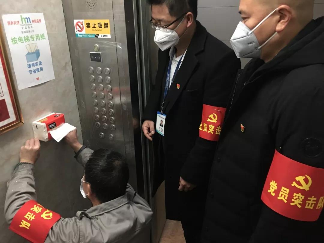 ▲黨員突擊隊(duì)正在更換小區(qū)對(duì)講系統(tǒng)、電梯按鍵防菌用塑料膜和按電梯專用紙。