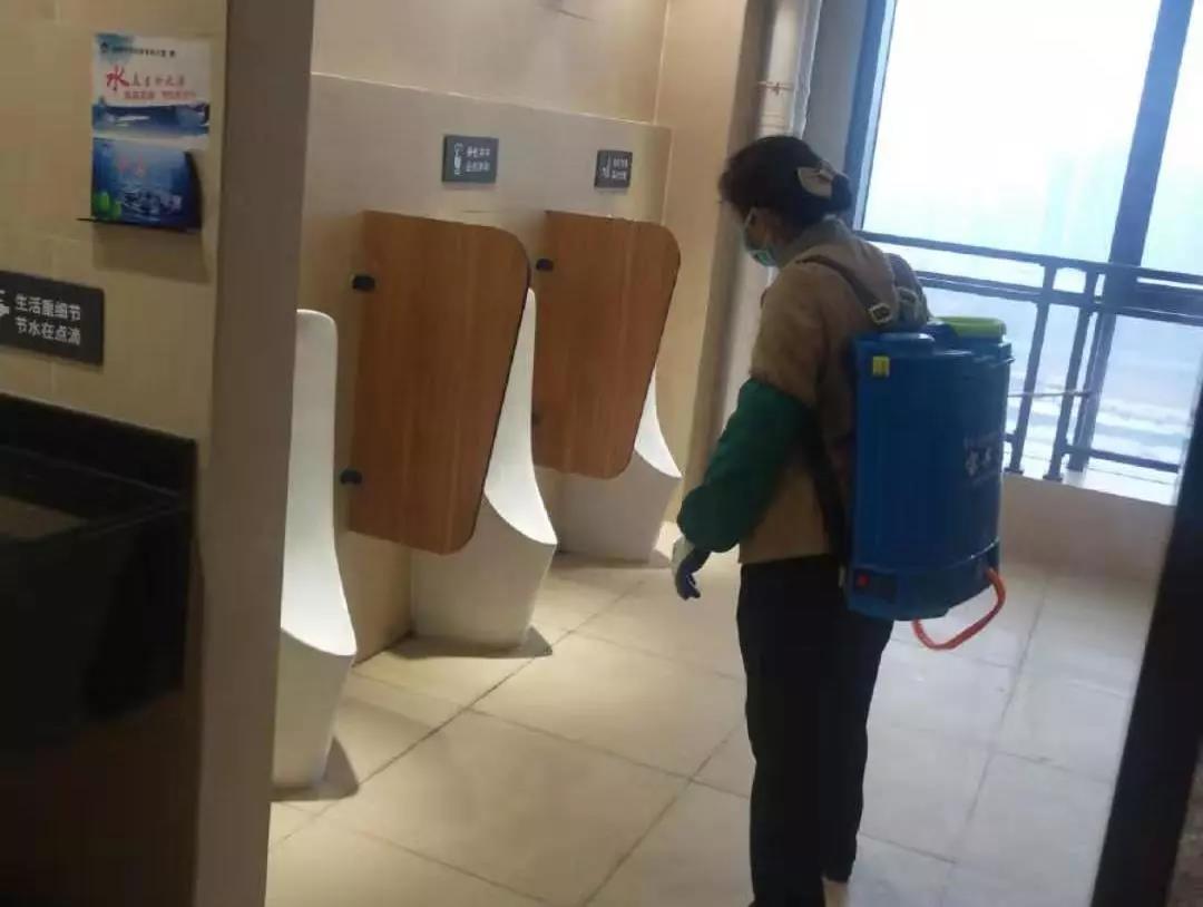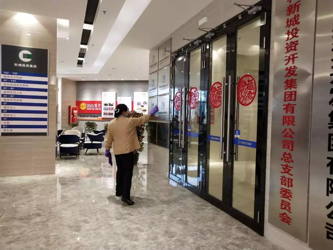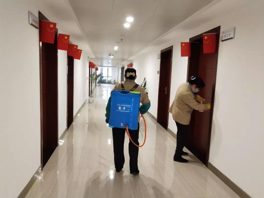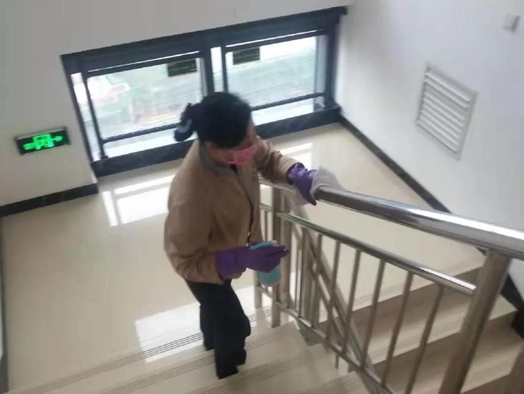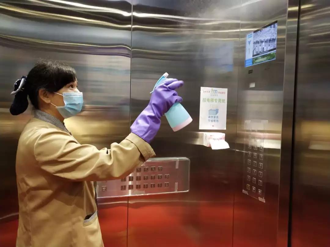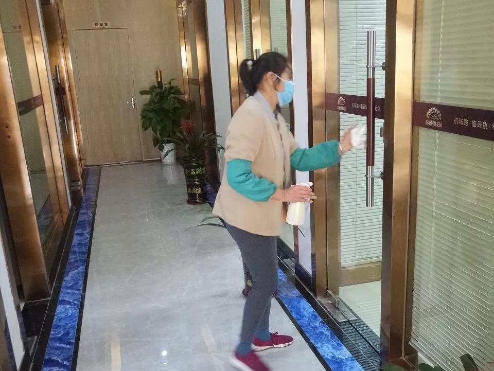 ▲保潔人員在對(duì)電梯、出入門廳、辦公區(qū)域、樓梯間、衛(wèi)生間等地進(jìn)行全面消毒。