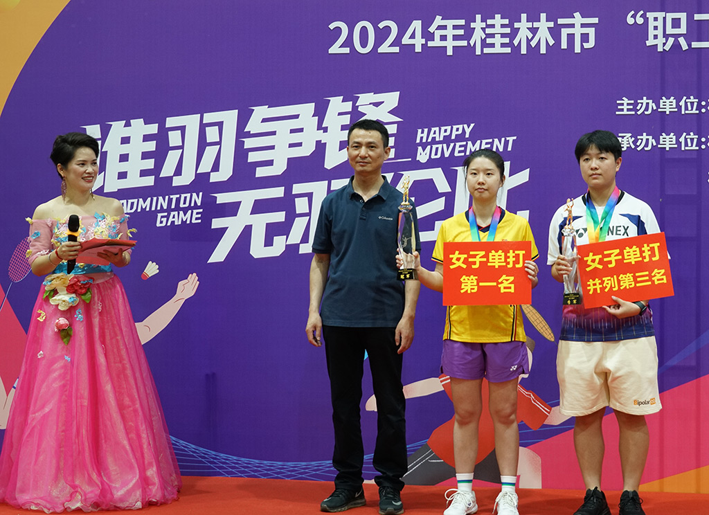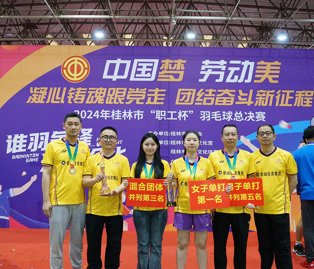 4月27日下午,由市總工會主辦的“中國夢 勞動美 凝心鑄魂跟黨走 團(tuán)結(jié)奮進(jìn)新征程”桂林市“職工杯”羽毛球比賽圓滿結(jié)束并舉行了頒獎儀式。新城投集團(tuán)羽毛球隊(duì)經(jīng)過激烈角逐,在36支參賽隊(duì)伍中摘得多項(xiàng)榮譽(yù):由公司黨委副書記(主持工作)、副董事長、總經(jīng)理朱毅擔(dān)任領(lǐng)隊(duì),吳萍明、龔志祥、楊衛(wèi)來、張欣婭、唐蒙組成的新城投集團(tuán)“黨旗映勝地”羽毛球隊(duì)榮獲團(tuán)體第三名;張欣婭榮獲女子單打第一名;楊衛(wèi)來榮獲男子單打第五名的優(yōu)異成績。