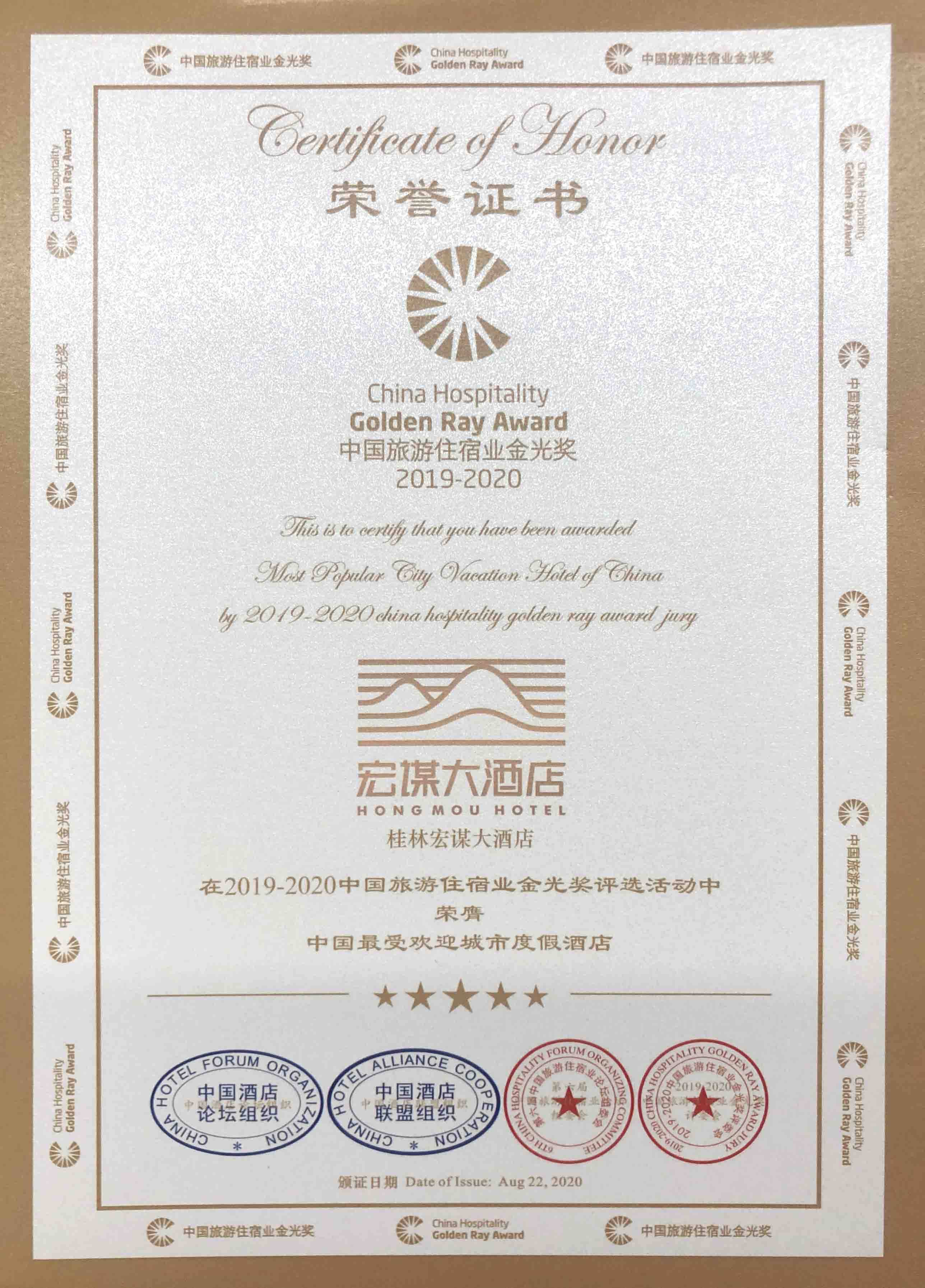 金光獎是中國旅游住宿行業(yè)跨業(yè)界、跨年度、覆蓋面最廣的獎項,獲獎評選經過各學術、專業(yè)、跨界領域評委根據(jù)各酒店競爭力、住房率、收益利潤等多個標準評選而出。桂林宏謀大酒店此次榮獲中國酒店金光獎的兩項殊榮,是對酒店不斷深化文化藝術主題,追求酒店優(yōu)秀服務品質的認可!
